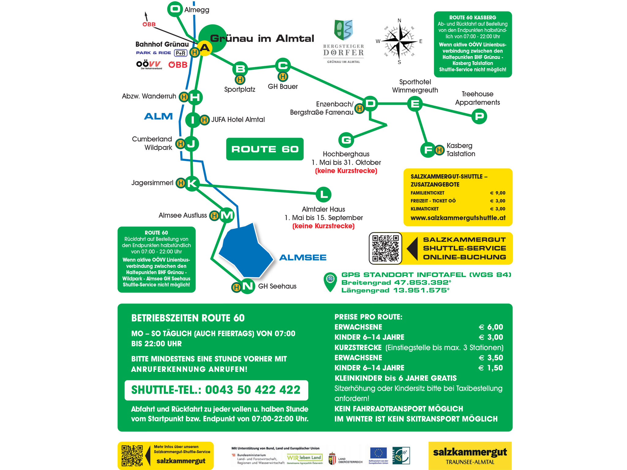 Umsteigemöglichkeiten zu den OÖVV Bus Linien in Grünau im Almtal Bahnhof Grünaun und weiteren Haltepunkten, Umsteigemöglichkeiten zur ÖBB Almtalbahn in Bahnhof Grünau im Almtal.